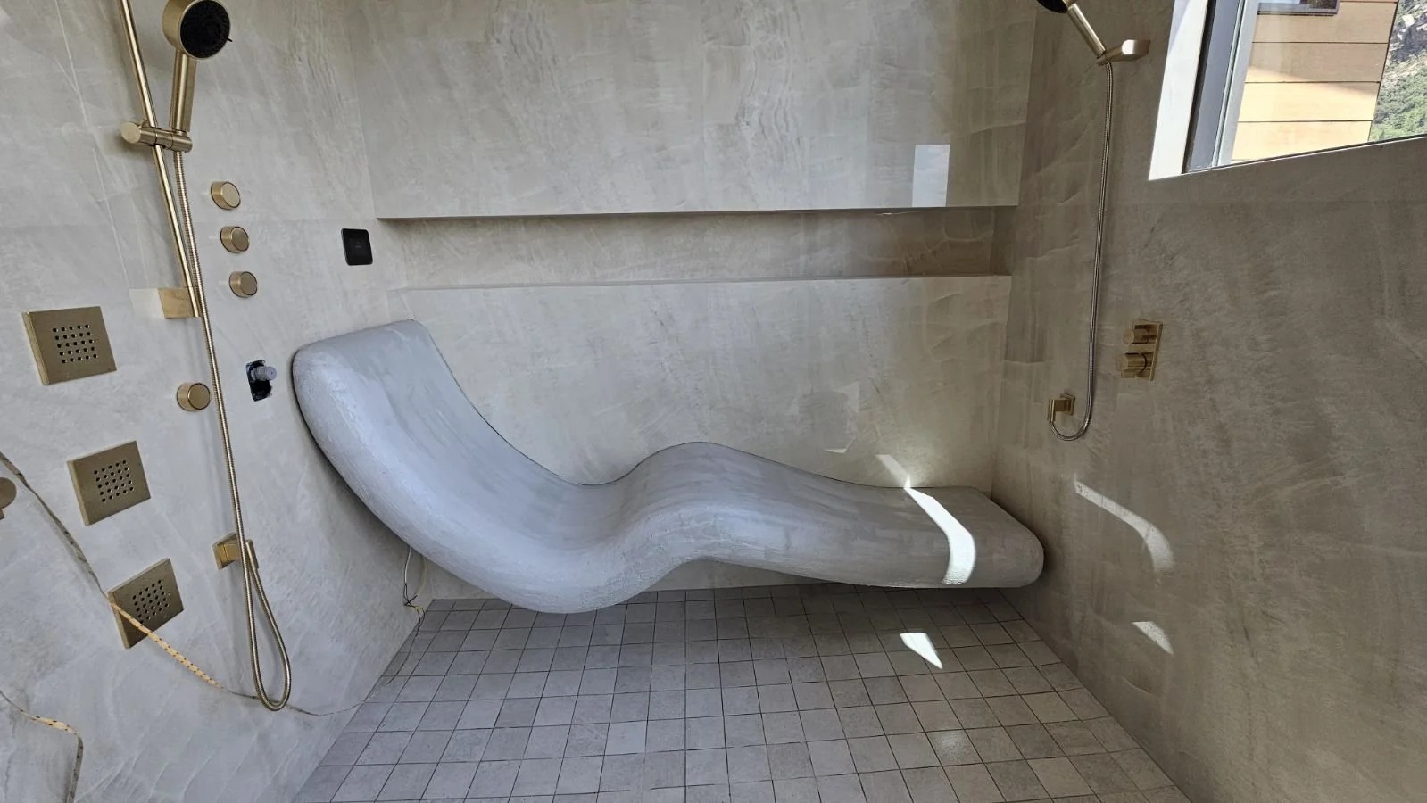 Projects Bathtub Surround Radius Walls and Ceilings Plaster Bench Parade Float Props Dog Wash Floating Marble Bench Fountain Steamer Bench Cold Plunge Podium Floating Shower Bench Spaceship Set Mosaic Lounger